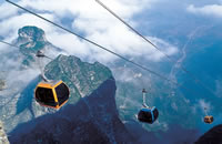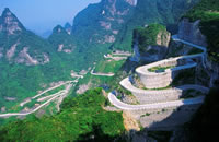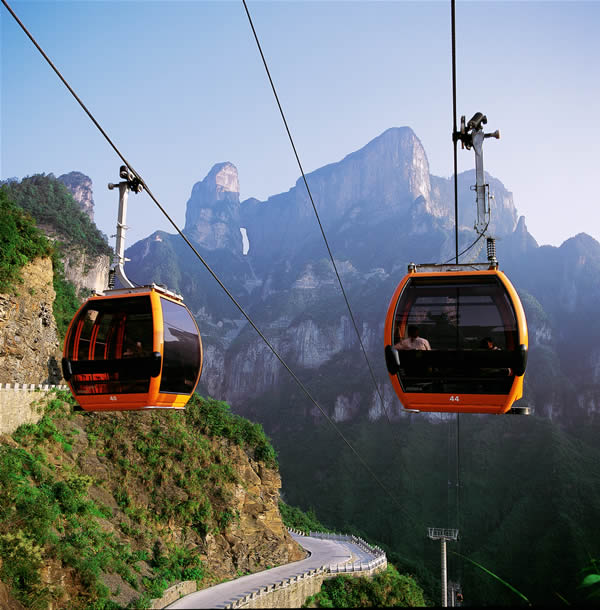 天門山國(guó)家森林公園距張家界市區(qū)南側(cè)約8公里,山頂南北寬1.93公里,東西長(zhǎng)1.96公里,面積2.2平方公里,海拔1518.6,這里以發(fā)育較齊全的巖溶地貌區(qū)別于武陵源的砂巖峰林景觀,是一座四周絕壁的臺(tái)形孤山。