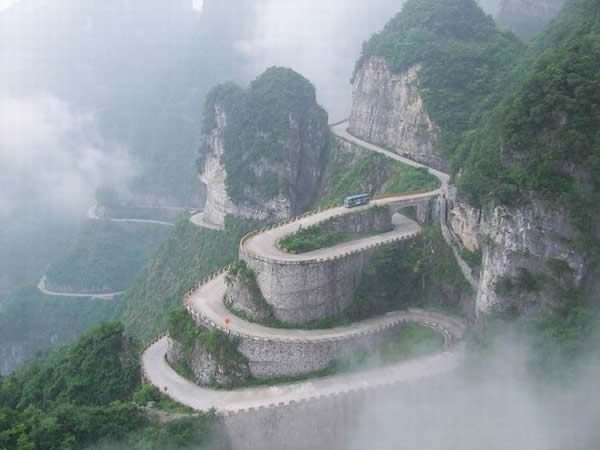 張家界天門山盤山公路有"通天大道"之稱,盤山公路全長10.77公里,海拔從200米急劇提升到1300米,大道兩側(cè)絕壁千仞,空谷幽深,共計(jì)99個彎,180度急彎此消彼長,似玉帶環(huán)繞,彎彎緊連,層層迭起,被譽(yù)為“天下第一公路奇觀”。