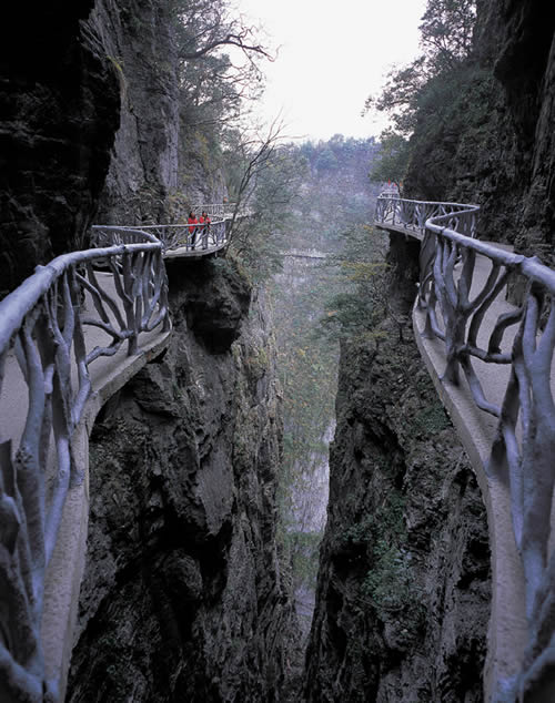 據(jù)施工人員介紹,此條棧道也是他們所修棧道中施工最難,最險峻的一條。如果您還覺得不夠刺激的話,在棧道的完結(jié)處的兩個懸崖之間有一條長160米的懸索吊橋,同時,在海拔最高點還有一個挑戰(zhàn)心里極限的玻璃站臺,在這里,如果你能挺直腰板伸開雙臂,那么,您就是真正的勇士了。