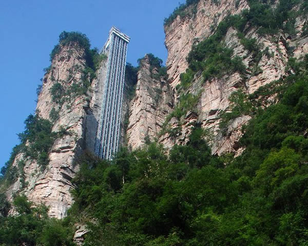 百龍?zhí)焯菀挥谑澜缱匀贿z產(chǎn)張家界武陵源風景名勝區(qū),1999年9月動工,2002年4月投入營運,電梯的主要設(shè)備由德國知名電梯公司研究生產(chǎn),耗資人民幣1.8億元,被譽為“世界上最高、運行速度最快、載重量最大的電梯”,也因此被載入吉尼斯世界紀錄。