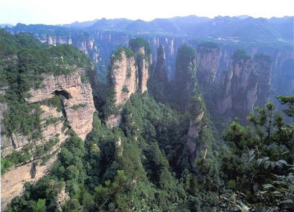 這就是大觀臺(tái)。極日遠(yuǎn)眺,千百座奇峰盡收眼底。一位詩人說,武陵源的砂巖石峰是一步一觀景,千步千造型,一山有四季,十步不同大。專家測(cè)算出武陵源石峰有3103座。一如一位高超的雕塑大師,模擬宇宙萬物,無不形態(tài)逼真,維妙維肖,栩栩如生,呼之欲動(dòng)。有的如海螺出水,有的如金龜銜日,有的如蓮花盛開,有的如天橋橫空,有的如長槍刺大,有的如寶塔聳立,有的如老人采藥,有的如玉女梳妝,有的如將軍出征,有的如戰(zhàn)馬長嘯,有的如情人幽會(huì),有的如夫妻相擁,有的如仙女散花,有的如村姑守望……有的孤峰獨(dú)秀,有的直插云霄,有的婷婷玉立,有的威武勇猛,有的小巧玲瓏,有的大氣磅礴。進(jìn)入武陵源,但見一片峰的森林,峰的世界,峰的海洋。挺拔、奇秀、集中、原始、粗獷、古野。這就是武陵源。 一位藝術(shù)大師說:武陵源的山峰,改寫了山的概念。大攝影家陳勃說 :“三山五岳堪比美,華夏風(fēng)光第一流!蓖趵^杰先生說:“武陵源上二日游,勝讀千篇李杜詩!痹S世杰先生說:“秀幽險(xiǎn)峻稱奇絕,五岳黃山拜·卜風(fēng)!崩畛扇鹣壬鸀榇舜蟊Р黄剑骸吧裰輨倬罢l為最?須請(qǐng)霞公重評(píng)勘。”可惜徐霞客無緣到大觀臺(tái)來,也不可能為武陵源作甚評(píng)價(jià)了。