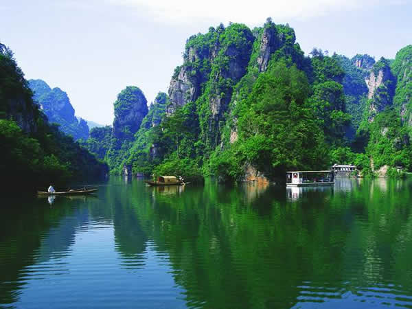 寶峰湖瀑布 湖中有兩座疊翠小島,近岸奇峰屹立,峰回水轉(zhuǎn)。泛舟漫游,只見(jiàn)一湖綠水半湖倒影,充滿詩(shī)情畫意!霸铺萑f(wàn)丈上天臺(tái),高峽平湖一鑒開(kāi),王母瑤池金扶,浣沙仙女下凡來(lái)”游寶峰湖,你就會(huì)欣賞到這樣的詩(shī)情畫意。群峰擁抱的寶峰湖,長(zhǎng)約2.,5公里,湖猶如一面寶鏡,四面青山,一泓碧水,蕩槳溫游,格外愜意。坐在船上,環(huán)顧四周,千山聳翠,俯視水中,倒影慢移,碧水照相館得群峰綠,人面桃花水映紅。真是靜極了,美極了!韓劇《九天洞》拍攝的湖水就是寶峰湖。