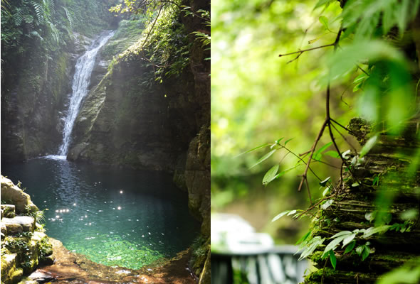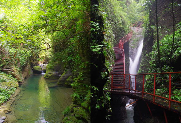 十八潭總名。稍作休憩,我們開始奔赴東線的景點(diǎn)。東線主要是以十八潭為主,下游有4潭:合潭、梳妝潭、魚潭、黑潭;中游有9潭:換衣潭、美人潭、石蛙潭、姊妹潭(3個)、情侶潭(2個)、二龍搶珠,上游有5潭:鬼谷神功(2個)、幽潭、落銀潭(彩虹潭)、路邊潭。十八個潭深淺不一,淺則1米以上,深則4米左右,形狀各異,有的月牙形,有的豬腰狀,形狀不規(guī)則,石壁上水沖成潭,真是鬼谷神功,此處水質(zhì)細(xì)膩,加之綠林映襯,水色碧綠見底,猶如十八顆翡翠石鑲嵌在山林之間,涓涓溪流晶瑩剔透,飛流直下的瀑布,氣勢磅礴,蔚為壯觀, 下游的4潭,合潭、梳妝潭、魚潭、黑潭。合潭是仙女峽谷與十八潭的交匯處;梳妝潭的水清如明鏡,又因為潭兩側(cè)石頭的封閉,使這面鏡子靜止不動,很方便梳妝,照鏡子。在梳妝潭周圍,有一種植物屬于紅豆杉系列,它的形狀好似梳子,可以用來梳頭。魚潭可不能望文生義。魚潭,是在冬天的時候,所有的魚都聚集在這里過冬,除此之外,這個潭水淺見底,冬天魚苗聚集,是捕魚的好季節(jié)。黑潭,水深不見底,所以叫黑潭,F(xiàn)在已經(jīng)看不見梳妝潭、魚潭、黑潭了,你猜為什么?建水庫,建水上樂園,淹沒了。 斷魂石的傳說。三國時期,高氏和蕭氏一對夫妻春節(jié)忙活,遇上了天門垮眼,受余震襲擊,打死了丈夫蕭氏。高氏思念丈夫,淚哭不斷,結(jié)果摔死潭中。人們經(jīng)常還能聽到哭聲傳來,不敢單獨(dú)行走,需成群結(jié)隊。后人為了鎮(zhèn)邪,雕刻一條蜈蚣驅(qū)趕哭魂,多年后,蜈蚣成精,天上打雷,巖石發(fā)光,遭雷所劈,成了斷魂石。 和尚姥,也就是丹灶峰,天門十六峰之一。相傳此峰為仙人化身,赤松子曾在此煉丹,許多詩人在此留下了美妙的詩篇,明代葉守禮《丹灶峰》: 懸崖峭壁隔塵寰,上有仙人學(xué)煉丹。 煉得丹成鶴已去,獨(dú)留丹灶在峰巒。 意思是說,在這險峻秀麗的山峰上,赤松子潛心煉丹,不受塵世干擾,身心沉醉于秀美的山間,沉溺于丹藥的煉制之中。作者很是羨慕那種與世隔絕的超脫,那種執(zhí)著于自我理想的瀟灑,你羨慕不羨慕? 竹林叢生。我們要學(xué)習(xí)竹子的精神,中空、謙卑;我們要學(xué)習(xí)竹子的精神,抱團(tuán)生長;我們要學(xué)習(xí)竹子的精神,破土而出,節(jié)節(jié)高。 向家塔。打造農(nóng)耕養(yǎng)生游的地方。種田、種菜、種花,農(nóng)家餐館。 爛泥巴根。爛泥巴根和馬桑樹是同科,是這里獨(dú)特的一種樹。馬桑樹亦稱“千年紅”、“馬鞍子”,屬落葉灌木,馬桑樹多枝叢生,一簇一簇的,枝葉像傘蓋,因此“馬桑樹兒搭燈臺”。春風(fēng)一吹,滿山的馬桑樹、爛泥巴根就吐翠滴綠,顯示出強(qiáng)勁的生命力。打油詩一首: 青青枝條四方走, 肥肥大葉落上頭, 身在路邊無人問, 冬去春來樂悠悠。 秋天死亡,春天長勢更加茂盛,它的新生是通過死亡實(shí)現(xiàn)的。山川如此,植物也是如此,這里的一草一木無不透露著道家那種齊生死、等貴賤的精神。 這叫“常道”亭,“道可道,非常道”,據(jù)說是白狐與劉海相遇的地方。吊橋。 十八潭各具特色。 中游有9潭。第五潭叫換衣潭。巖石聳立,霧氣氤氳,巖壁上布滿水汽,猶如雨下。又因過道狹窄,行人需彎腰通過,未免雨水打濕衣裳,在此就要脫下身上衣物,通過后在第六潭再穿上。因此第六潭又叫美人潭,很幽深神秘的。第七潭叫石蛙潭,水淺,又比較平穩(wěn)、安全,春天產(chǎn)籽。余音回響,猶如蛙鳴,給人“聽取蛙聲一片”的錯覺。 對面巖壁叫“臘肉鋪”,那條自上而下的溪流叫“酒長流”,客人來了,咱土家人熱情,臘肉下炕,苞谷燒,喝兩口! 第八潭第九潭叫情侶潭,比較隱蔽,他倆靜悄悄地談著情話,我們快走,不要打攪他們。 第十潭、十一潭、十二潭叫姊妹潭。下面那個,水淺淺的,溫溫的,是幺妹潭,中間那個是二哥潭,上面那個是大哥潭。 潭的旁邊有珍稀植物馬蘭花,馬蘭花又名蝴蝶花、蝴蝶蘭,為多年生宿根草本花卉,根莖短粗,肥壯;ù笮缕妫ㄉk麗,鮮艷奪目;ㄓ兴{(lán)、白、黃、雪青等色;ㄆ5-6個月,每次花可開花7-10天,頗耐觀賞。馬蘭花在我國栽培已有2000多年的歷史,目前歐、亞、非3洲均有分布,品種極多,難以計數(shù)。此花按植株高度不同可分3種類型:矮株型僅18-25厘米,中株型高25-70厘米,高株型可高達(dá)120厘米。馬蘭花喜陽光,適栽于背風(fēng)向砂質(zhì)土壤中。 馬蘭開花的童謠。他們?nèi)⒚眯r候情感深厚,常常一起跳皮筋。大家會跳嗎?會唱嗎? 小汽車,滴滴滴,馬蘭開花二十一, 二五六二五七,二八二九三十一, 三五六三五七,三八三九四十一, 四五六四五七,四八四九五十一, 五五六五五七,五八五九六十一 ! 還有紅豆杉,像梳頭的篦子,叫“篦子三尖杉”。還有蘭心草,中草藥,空中飄來蘭花的香氣,山谷中峭壁的蘭花,如芳芳人品善良高雅。蘭花如人品有宜人的香氣,蘭花有撩人的幽香,任何花卉的香氣都不能與蘭花比。這幽香時隱時現(xiàn),時濃時淡,時遠(yuǎn)時近。飄蕩在老道灣山谷中,給人清新和愉快的感受。 蘇轍有詩:“谷深不見蘭生處,追逐微風(fēng)偶得之”。 還有大葉榕、玉葉金花、秋海棠、臘蓮繡球、四字馬蘭、紅楓,秋天來臨,看!漫山紅遍,層林盡染。 聞道亭。孔子曰:朝聞道,夕死可以。意思是說,人生悟到“道”的真諦是多么重要,如果是早上知道的,哪怕晚上去死都是值得的。 第十三潭叫二龍搶珠。兩條瀑布傾