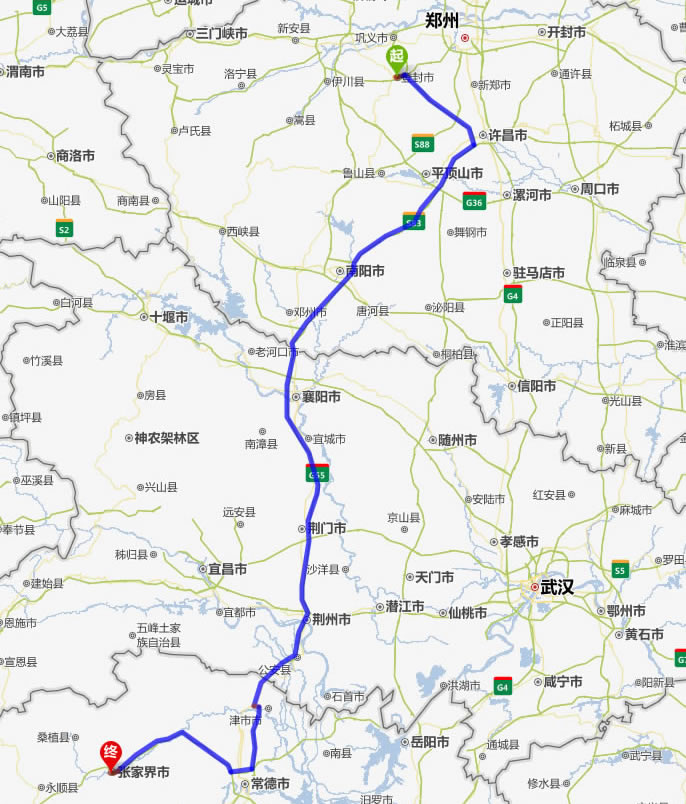 登封去張家界自駕車自助游線路圖全程高速):