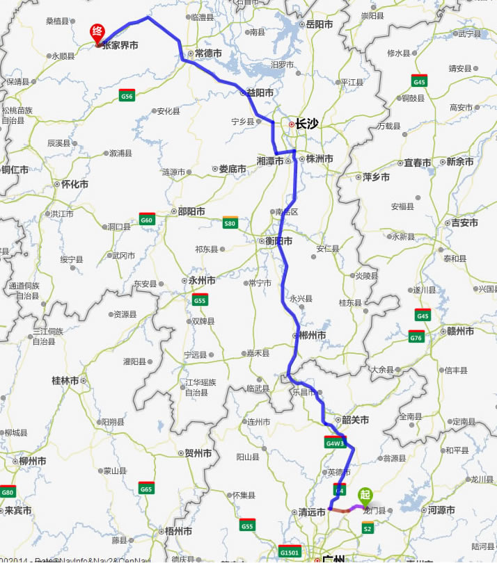從化去張家界自駕車自助游線路圖全程高速):