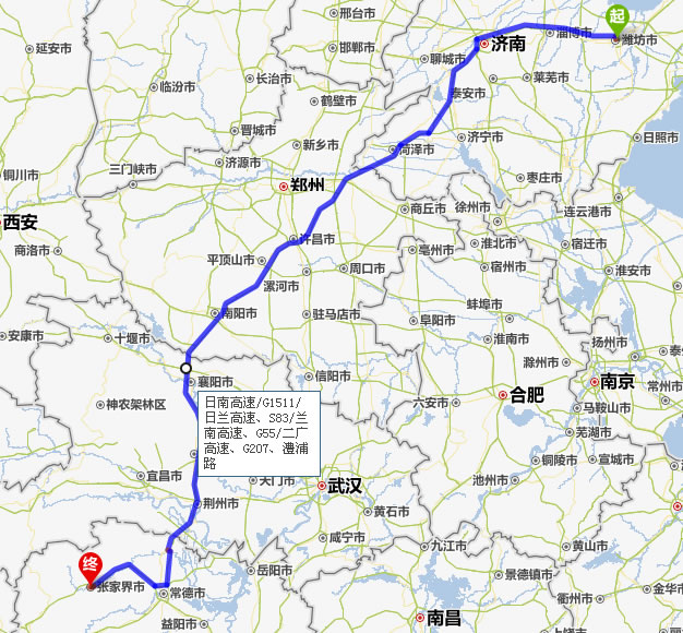 左右,沿途經過維坊市——淄博——濟南——平陰縣——菏澤市——蘭考縣——許昌市——平頂山——南陽——襄陽——荊門——荊州——常德(也可以走國道經澧縣、石門縣)——慈利——張家界。