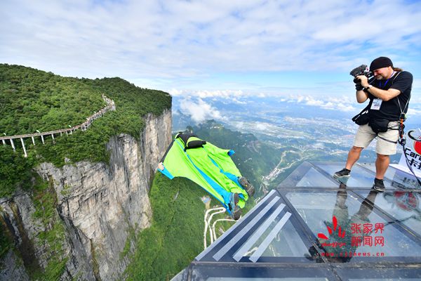 2017世界翼裝飛行世錦賽將于9月8日-10日在張家界天門山舉辦。開賽在即,9月7日上午,來自全球11個(gè)國家的16名翼裝飛行員從海撥1458米的張家界天門山玉壺峰頂一躍而下,在奇峰險(xiǎn)壑間進(jìn)行競速訓(xùn)練。